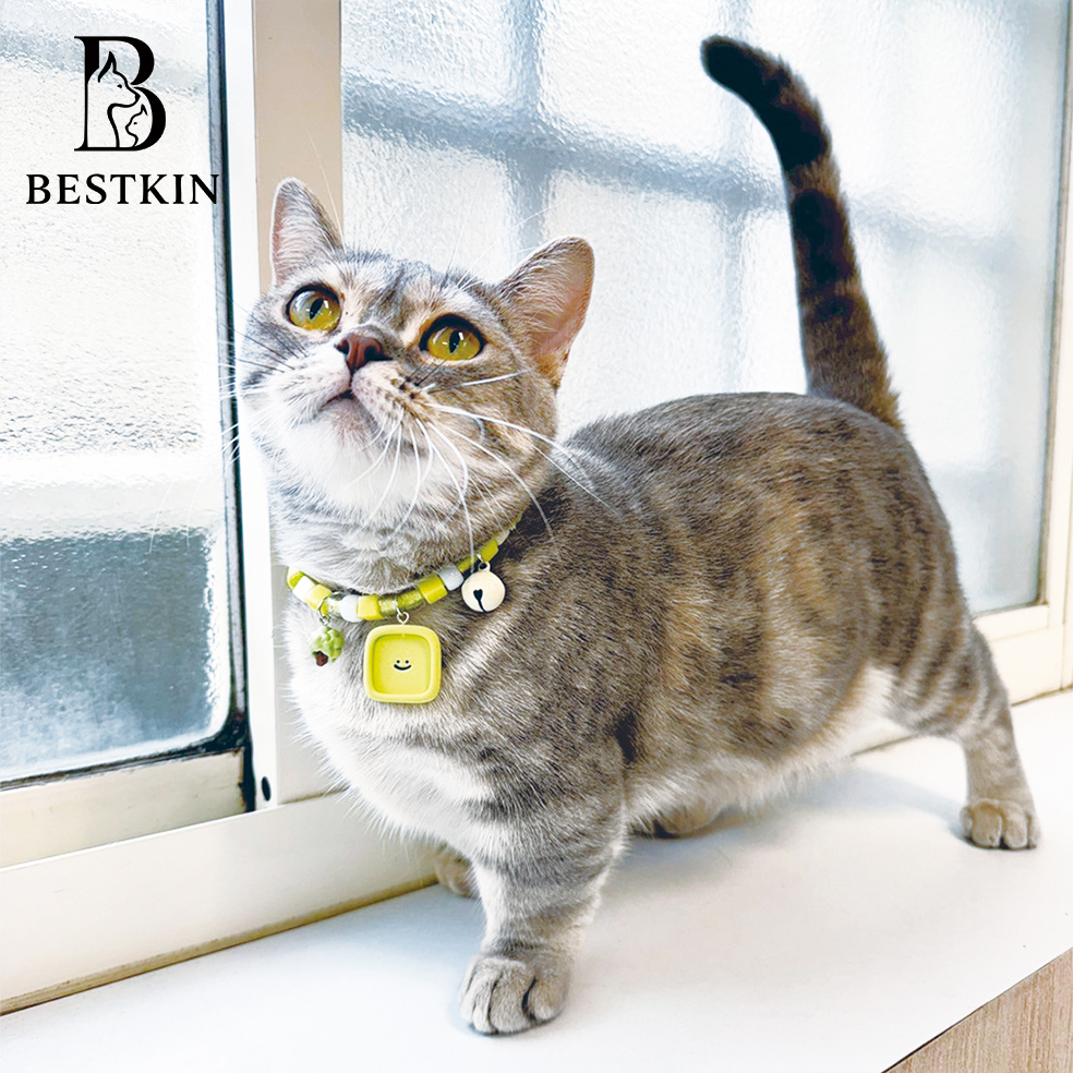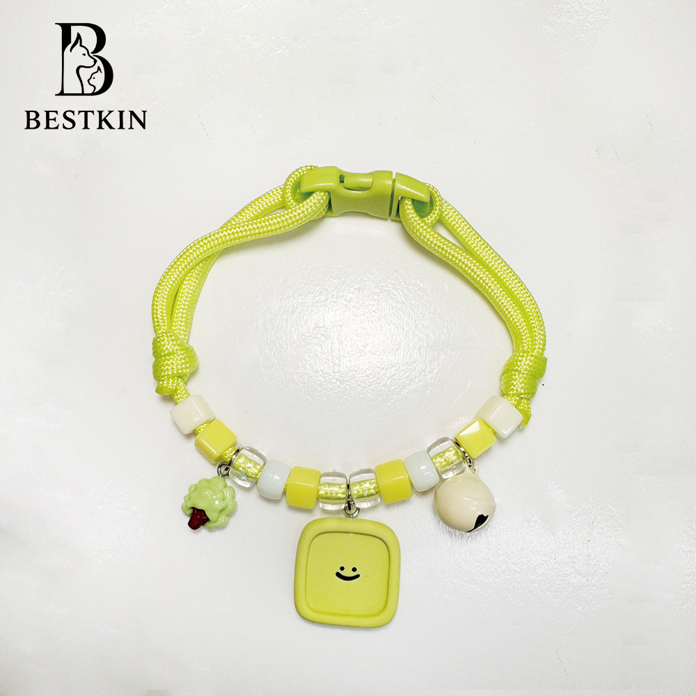 夏日森林寵物項圈, 清新綠黃配色,搭配微笑方塊與可愛小樹吊飾,滿滿活力感,讓毛孩每天都像在夏日森活中!